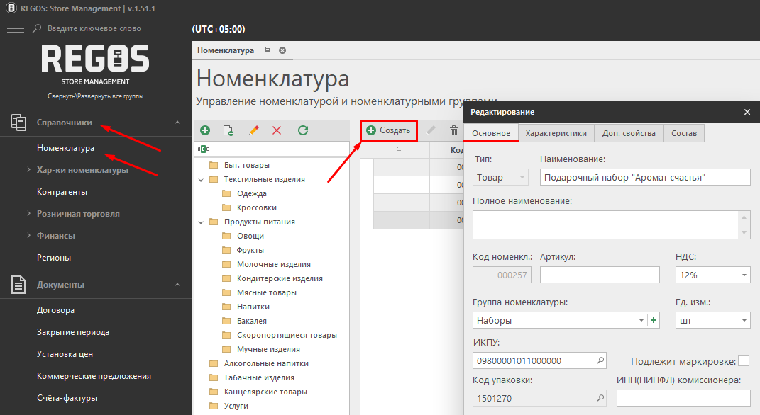 - Перейдите в раздел "Номенклатура" и добавьте новую номенклатуру.
