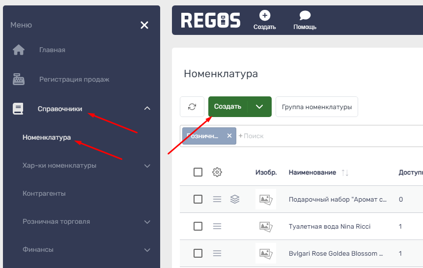 - Перейдите в раздел "Номенклатура" в Сервисе REGOS.