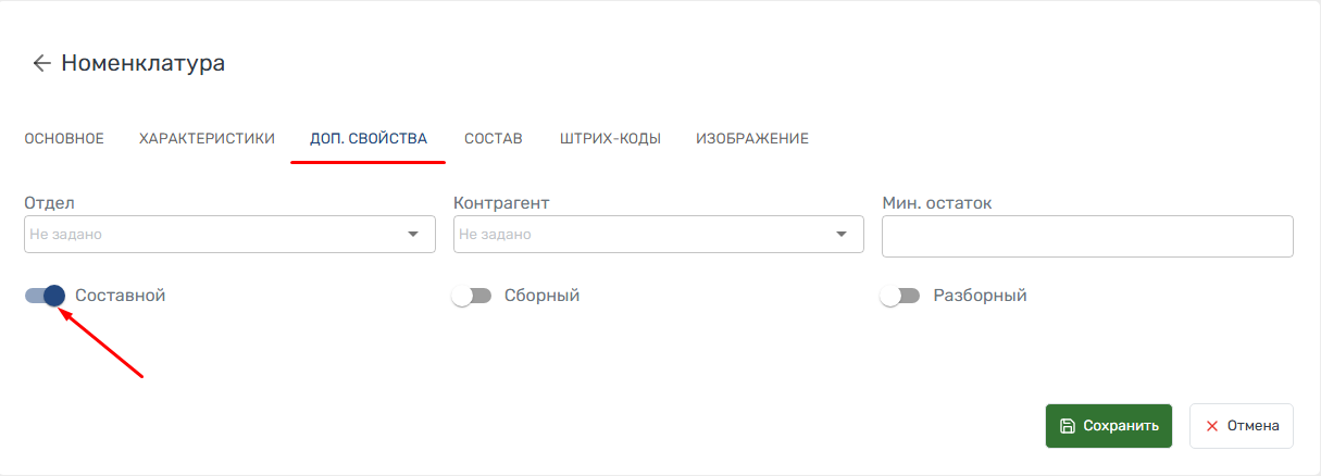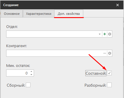 На вкладке "Доп. Свойства" укажите, что товар является составным, чтобы система корректно его учла при продаже.
