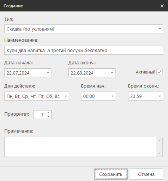 2. Создайте новую программу лояльности, выбрав тип промоакции Скидка (по условию). Заполните наименование и даты акции.