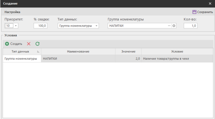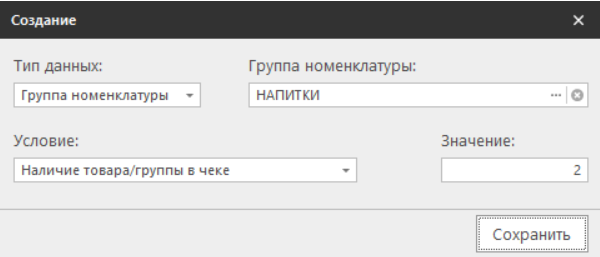 4. Создайте условие и укажите, что акция действует только при покупке 2-х напитков. Укажите группу номенклатуры: Напитки и в значениях напишите цифру 2.