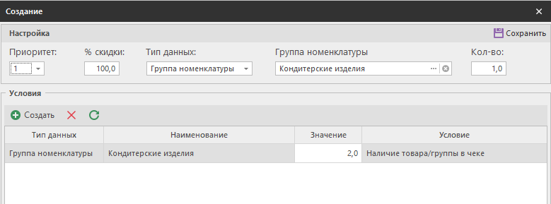 - Укажите условие: при покупке двух товаров из группы «Сладости».