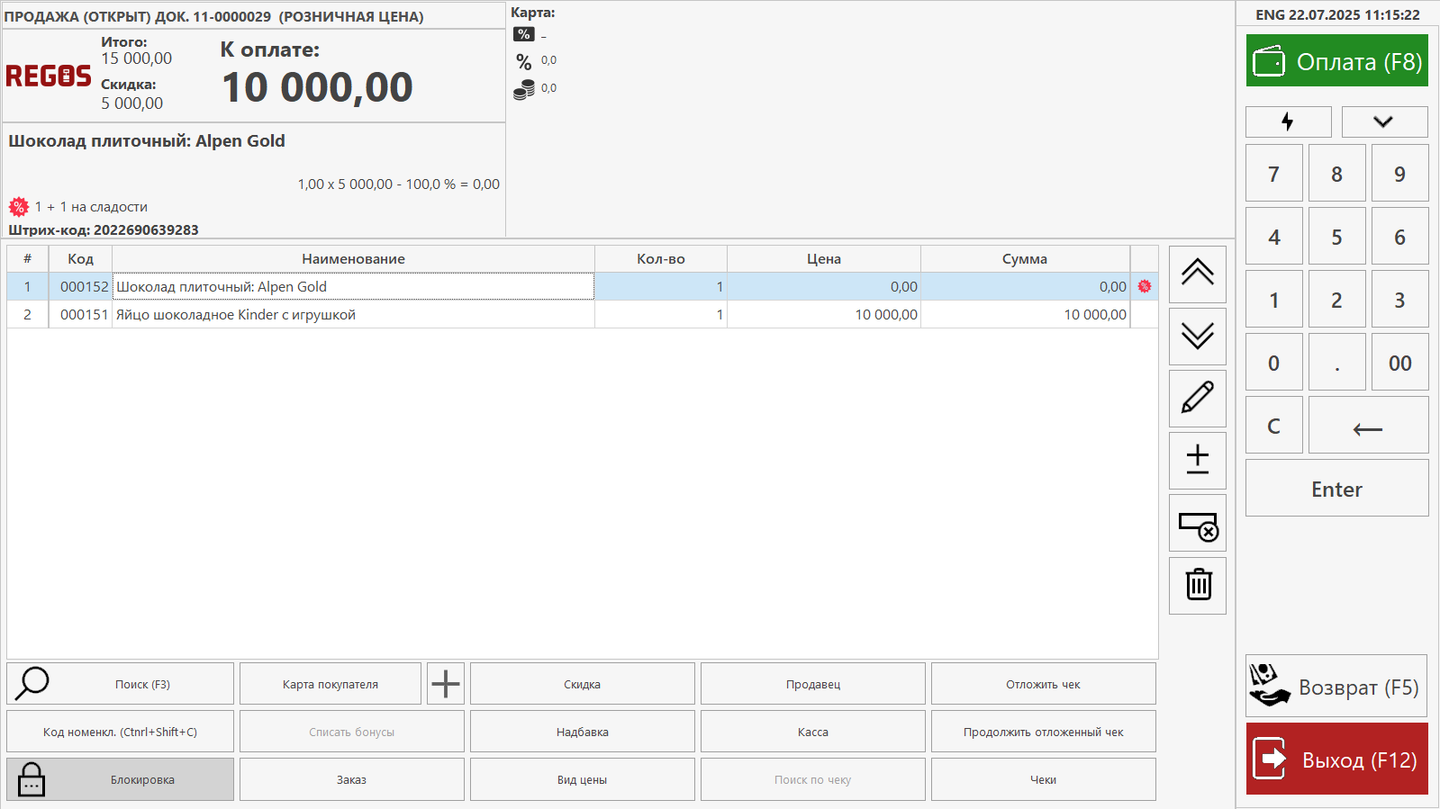 На кассе кассир сканирует два товара из категории «Сладости» – система автоматически применяет скидку 100% на один из товаров.