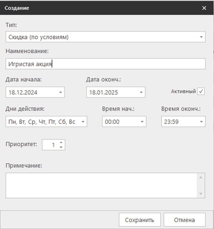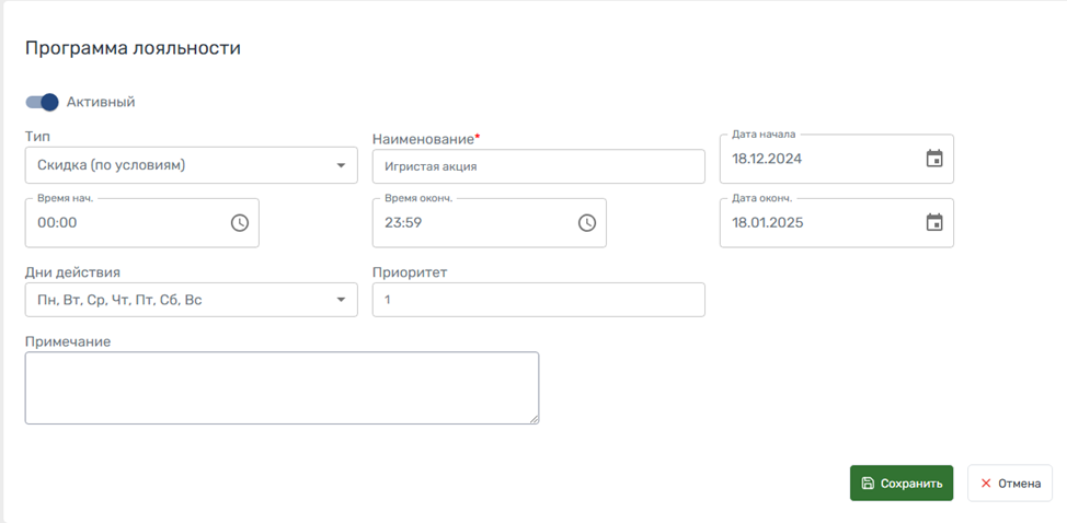 2. Создайте программу лояльности. Выберите тип программы лояльности — скидка (по условиям), которая предоставляет скидку в зависимости от позиций или суммы в чеке. Укажите наименование программы, дату начала и окончания акции, установите метку "Активный", дни действия, время начала и окончания, а также порядок применения программы лояльности (приоритет).