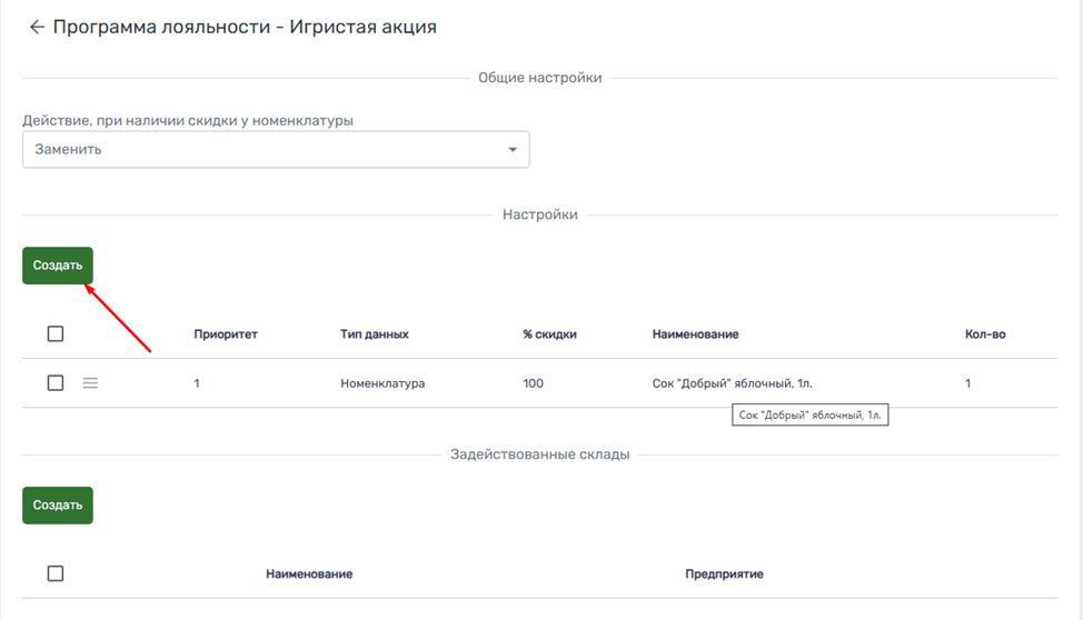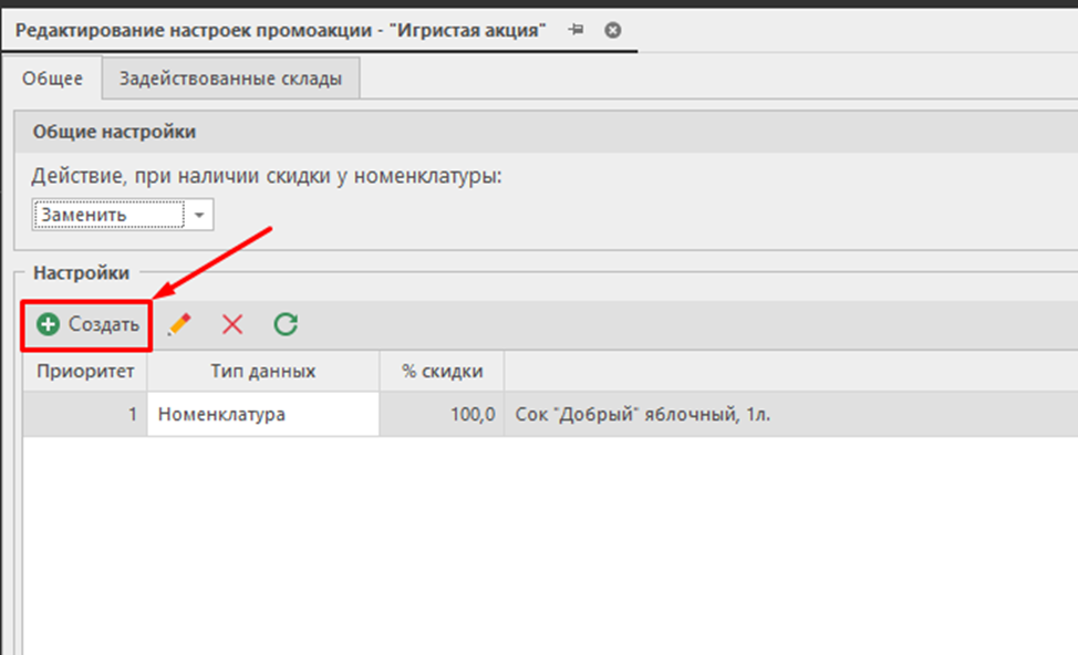 3.3. В разделе «Настройка» укажите объекты чека, к которым будет применена скидка, и определите приоритет. Установите скидку 100% на яблочный сок в количестве 1 упаковки.