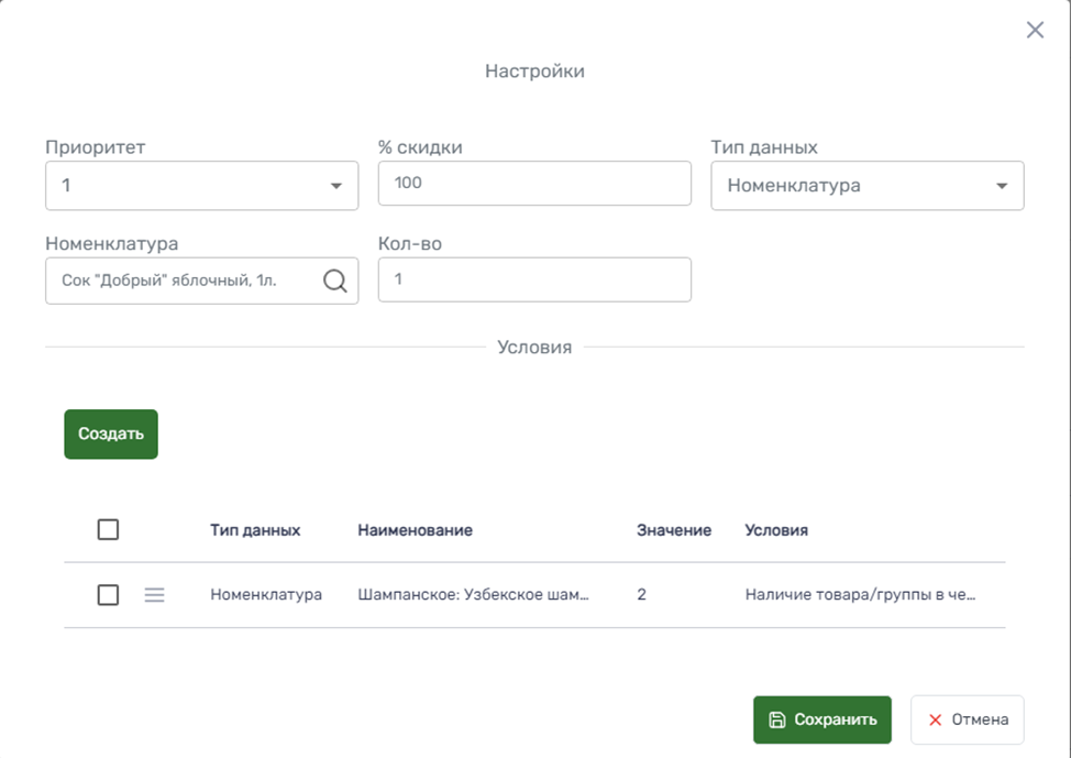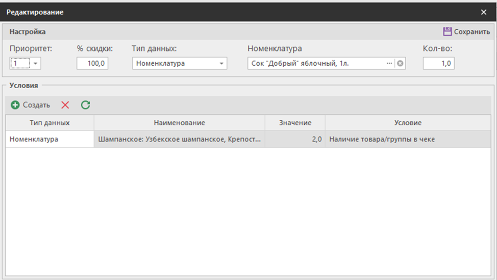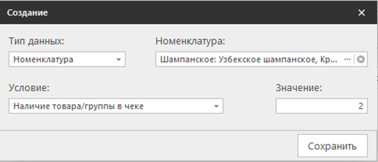 Новое условие добавляется с помощью кнопки Создать. Добавьте новое условие: укажите номенклатуру «Шампанское» и установите условие наличия в чеке двух бутылок шампанского.