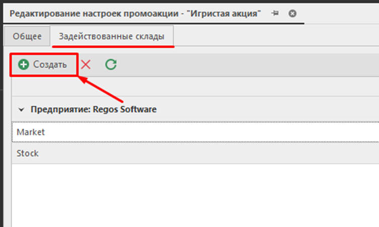 3.5. На вкладке «Задействованные склады» укажите склады, на которые будет распространяться скидка.