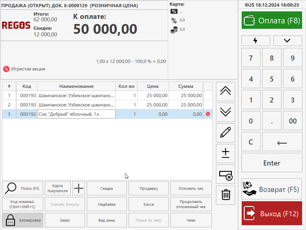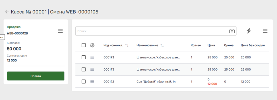 4. Проверка на кассе. На кассе отсканируйте штрих-коды шампанского и сока. В случае выполнения условий акции яблочный сок будет продан по нулевой стоимости со 100% скидкой.