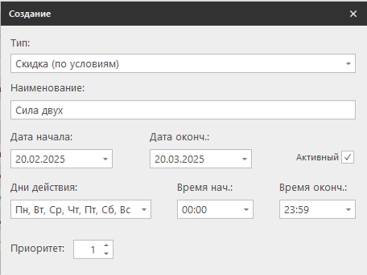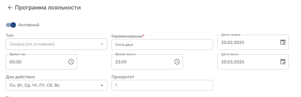 2. Создайте программу лояльности. Выберите тип программы лояльности — скидка (по условиям), которая предоставляет скидку в зависимости от позиций или суммы в чеке. Укажите наименование программы, дату начала и окончания акции, установите метку "Активный", дни действия, время начала и окончания, а также порядок применения программы лояльности (приоритет).