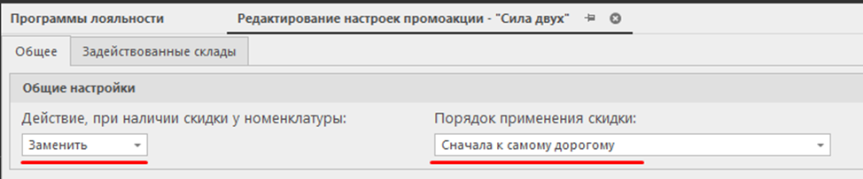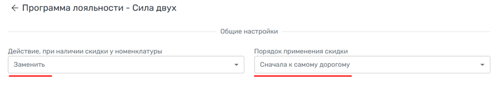 3.1 В общих настройках укажите действие при наличии скидки у номенклатуры. Это действие выполняется, если товар ранее получил скидку по другой программе лояльности. Варианты: