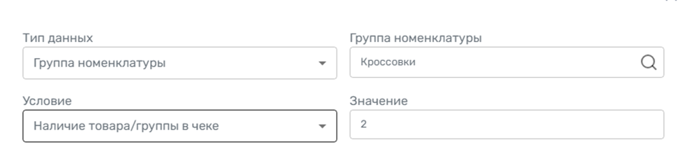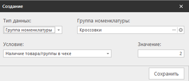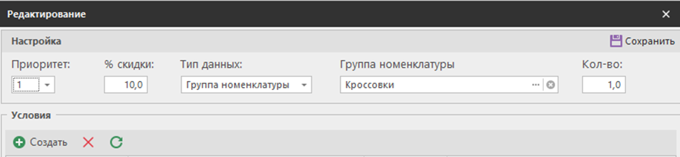 3.4 В разделе «Условия» в списке представлены условия, при выполнении которых будет предоставлена скидка, указанная ранее в разделе «Настройка». Новое условие добавляется с помощью кнопки «Создать». Добавьте новое условие: укажите нужную группу номенклатуру и установите условие наличия в чеке двух пар кроссовок.