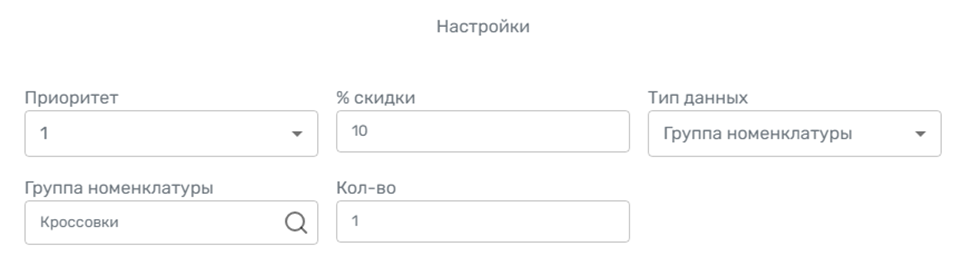 3.3 В разделе «Настройка» укажите объекты чека, к которым будет применена скидка, и определите приоритет. Установите скидку 10% на группу номенклатуры с кроссовками.