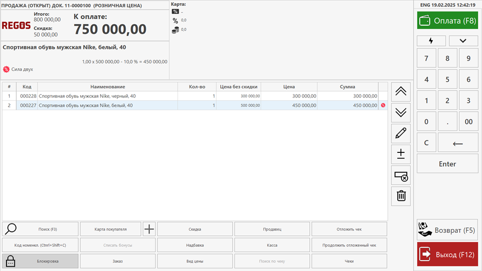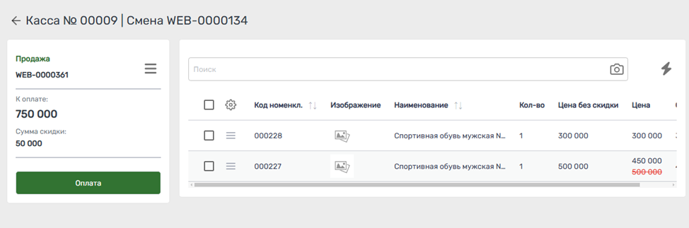 4. Проверка на кассе. Когда кассир пробивает две пары кроссовок, система автоматически применяет скидку на более дорогую пару. На кассе это будет отображено в виде суммы скидки, и покупатель увидит реальную экономию при расчете.