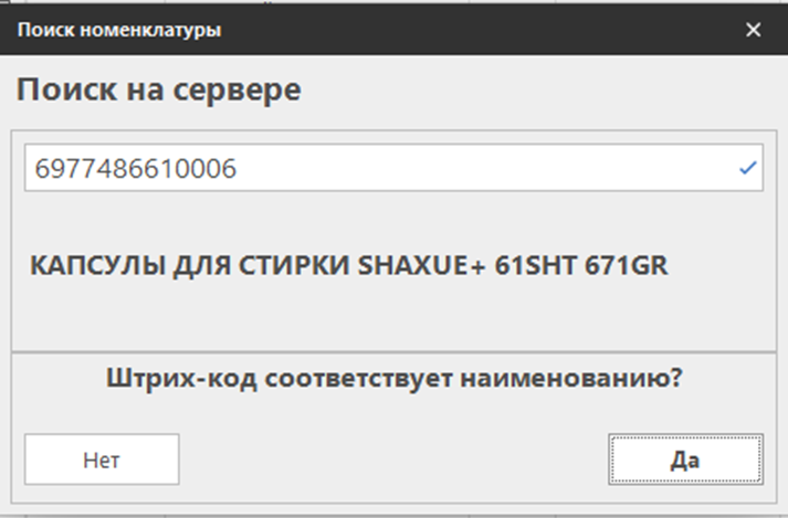 После этого откроется окно, в котором необходимо отсканировать штрихкод товара или ввести его вручную. При наличии введённого штрих-кода отобразится название найденной позиции номенклатуры и вопрос о том, соответствует ли найденное название штрих-коду.