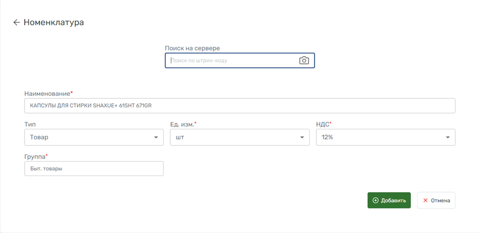 В открывшемся окне отсканируйте сканером штрих-кодов или введите вручную штрих-код номенклатуры. При наличии введённого штрих-кода заполнятся поля с названием найденной позиции номенклатуры, типом, единицей измерения, ИКПУ, НДС и группой номенклатуры.