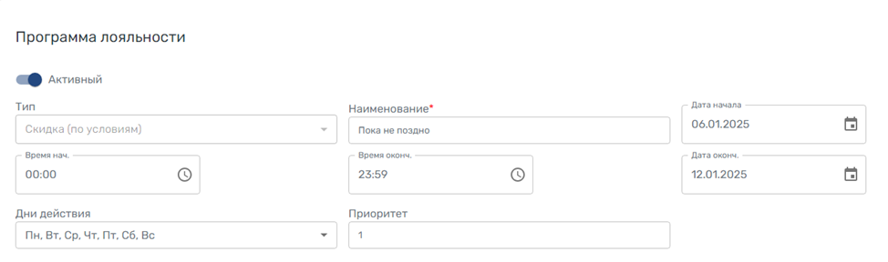 3. Создайте программу лояльности. Выберите тип программы лояльности — в данном случае это будет программа со скидкой (по условиям). Установите следующие параметры:
