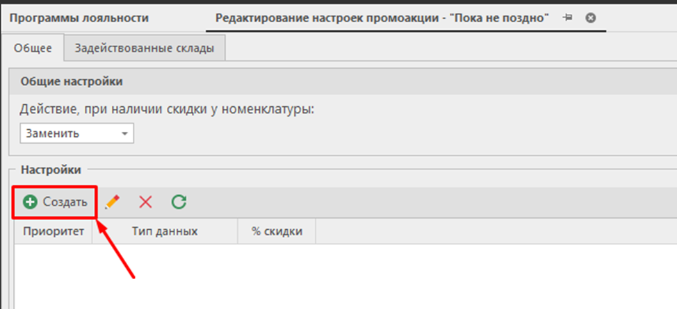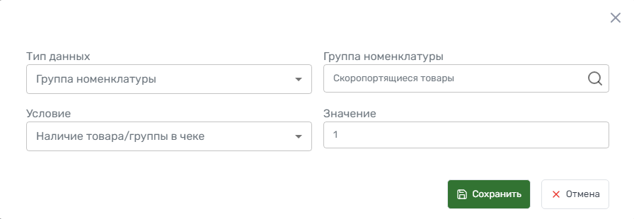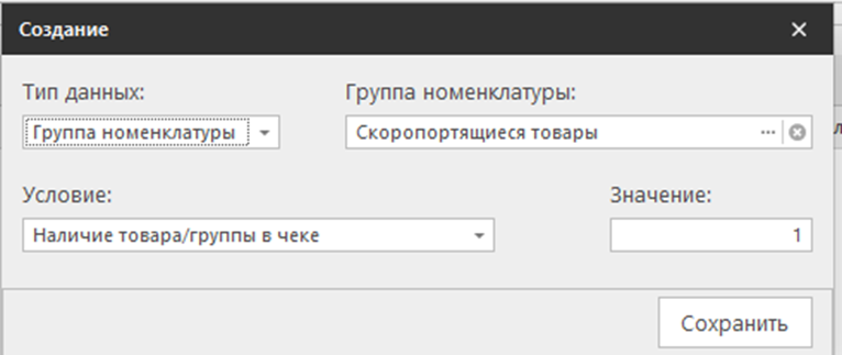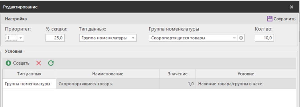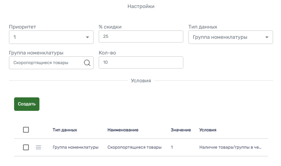 4.2 Настройте условия для предоставления скидки. Для этого добавьте новые условия, которые будут проверять наличие в чеке скоропортящихся товаров. Для добавления новых условий используйте кнопку «Создать».