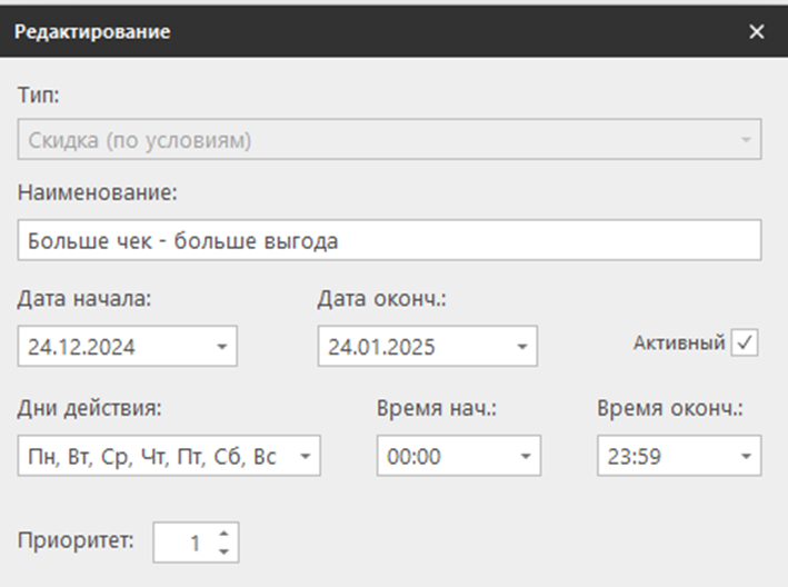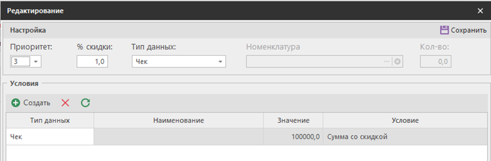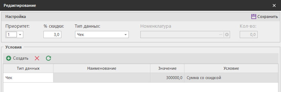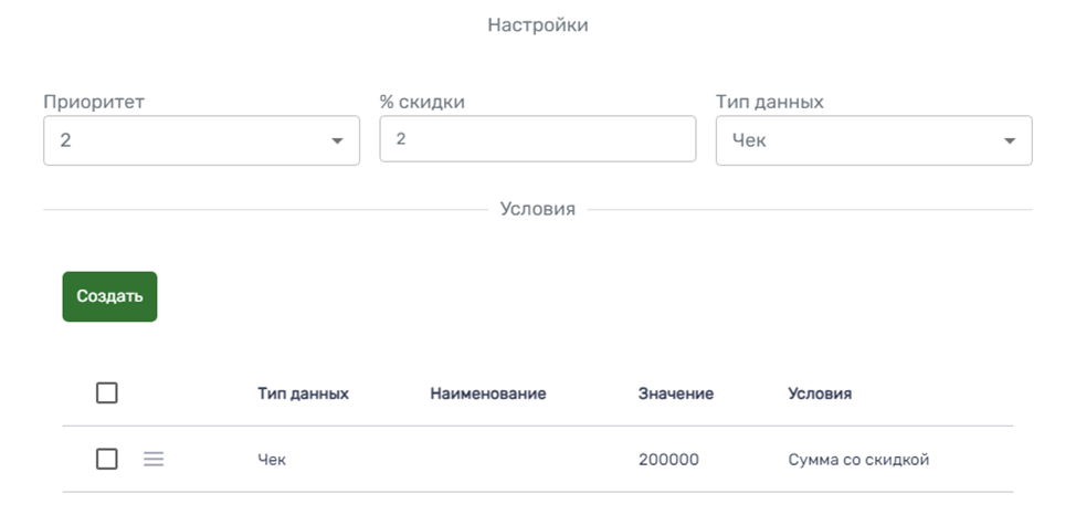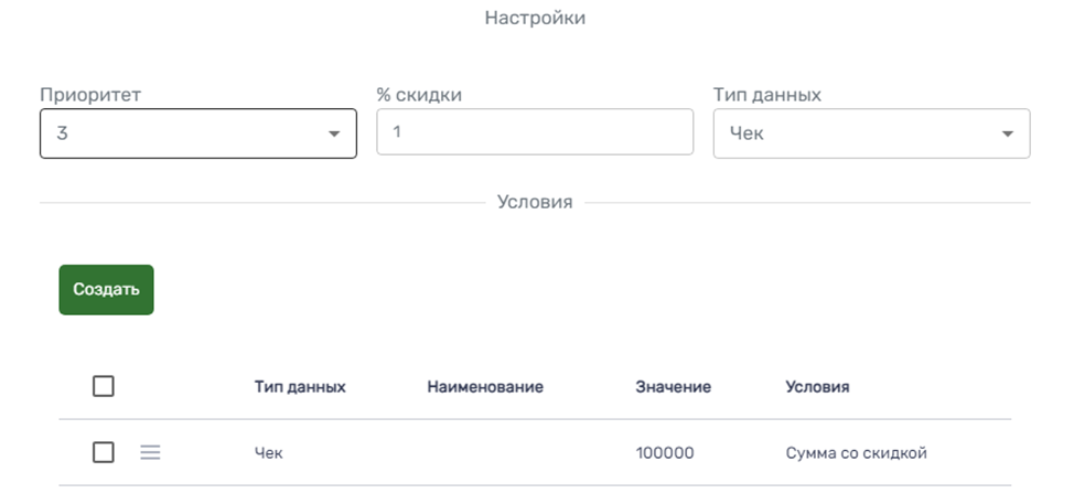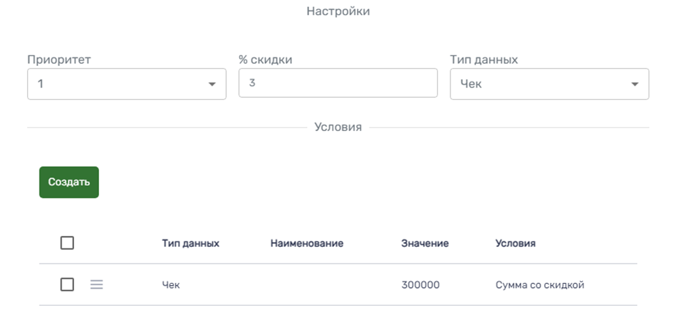 3.2 Настройте условия для получения скидки. Для этого добавьте новые условия, которые будут проверять сумму чека. Для добавления нового условия используйте кнопку «Создать». Всего будут созданы три условия: при покупке на 100 000 сум скидка составляет 1%, на 200 000 сум - скидка 2% и на 300 000 сум - скидка 3%. 3.3 В разделе «Настройка» укажите объекты чека, к которым будет применена скидка, и определите приоритет. Установите скидку 1% на чек в первом условии с приоритетом 3, 2% во втором условии с приоритетом 2 и 3% в третьем условии с приоритетом 1. Также к каждой настройке добавьте соответствующее новое условие, в котором покупатель должен приобрести товары на сумму 100 000 сум, 200 000 сум и 300 000 сум. Эти условия гарантируют, что скидка будет предоставлена только при достижении нужного порога.