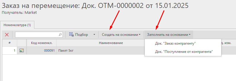 Заполнить на основании — сформировать "Заказ контрагенту" или "Поступление от контрагента".