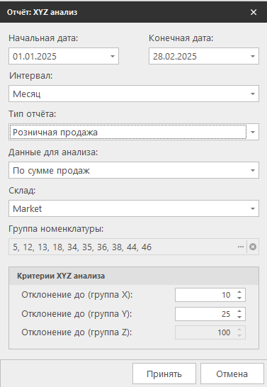 Чтобы создать отчет по XYZ анализу в Сервисе REGOS, необходимо задать несколько ключевых параметров: