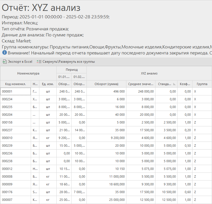 - Группа X — товары с стабильным спросом. Эти товары имеют небольшие колебания в спросе, что позволяет точно планировать их закупки и запасы.