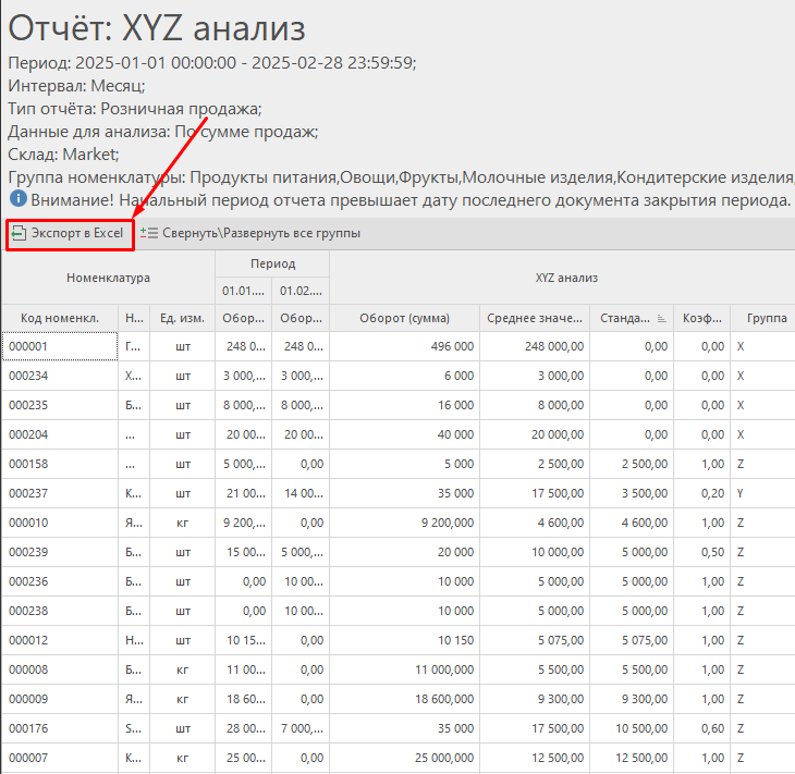 Подготовленный отчет можно экспортировать в Excel с помощью кнопки «Экспорт в Excel», расположенной в верхней части таблицы отчета. Это позволяет сохранить и обработать данные для дальнейшего анализа.