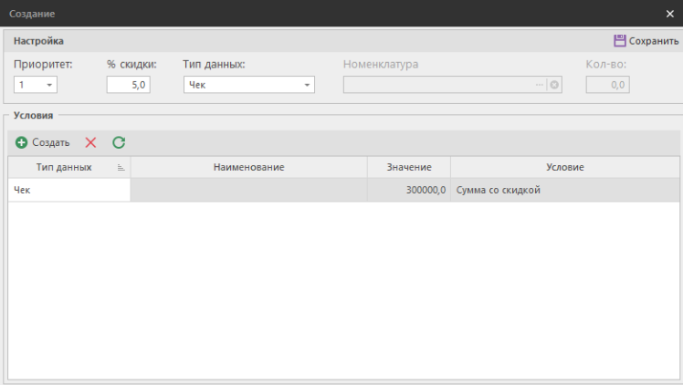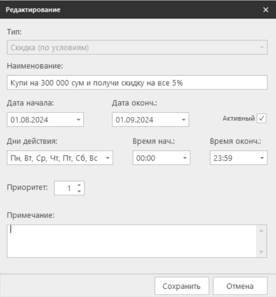 Промоакция создана! Теперь, когда клиент совершит единоразовую покупку на 300 000 сумов и более, он получит скидку 5% на весь чек.