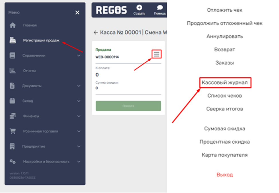 1. Перейдите в раздел "Регистрация продаж" и через меню выберите "Кассовый журнал".