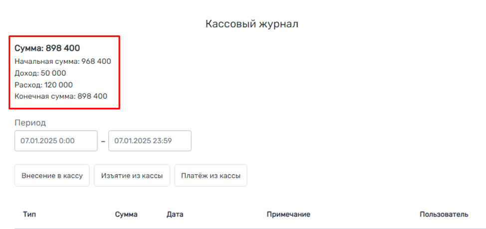 Кассовый журнал отображает текущую сумму в кассе, а также начальные и конечные остатки, суммарные доходы и расходы наличных средств. Эти данные позволяют отслеживать все изменения в кассовом балансе и анализировать текущую финансовую ситуацию магазина.