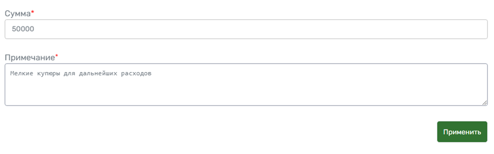 Для внесения денежных средств в кассу нажмите кнопку «Внесение в кассу», введите необходимую сумму, укажите причину и сохраните изменения. Эта функция позволяет быстро пополнить кассу и обновить данные о наличии средств. Как и в случае с изъятием, все изменения отображаются в кассовом журнале. Также она не зачисляет средства на счет, а только изменяет текущее количество наличных средств в кассе, отображаемое в журнале.