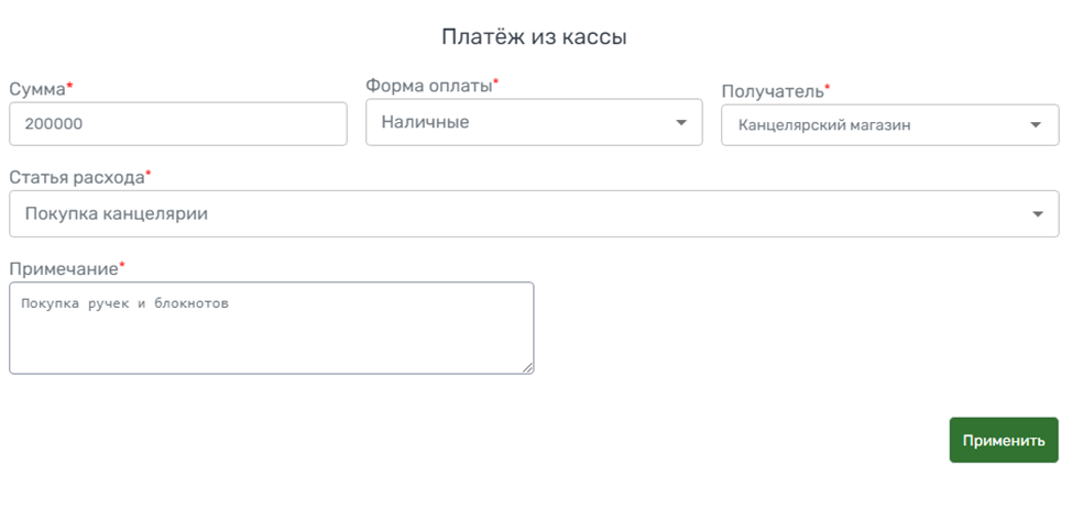 Для проведения платежа из кассы нажмите кнопку «Платеж из кассы», введите сумму, выберите форму оплаты, получателя и статью расхода, укажите причину платежа и сохраните операцию. Эти данные будут отображены в журнале, что поможет отслеживать все расходы наличных средств и правильно вести учет. Эта функция списывает средства со счета программы, а также изменяет текущее количество наличных средств в кассе.
