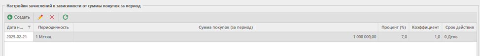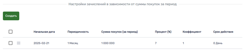 После создания бонусной системы программы лояльности перейдите на вкладку «Периодические зачисления» и в настройках зачислений в зависимости от суммы покупок за период и создайте зачисления в зависимости от суммы покупок.