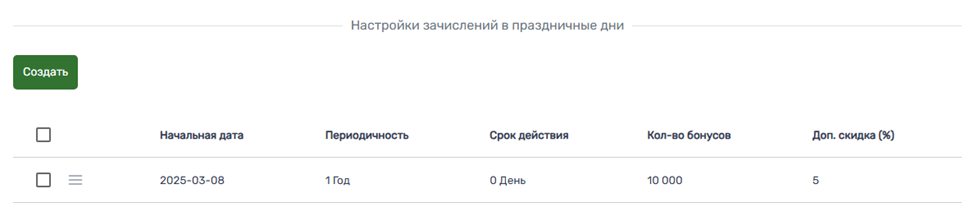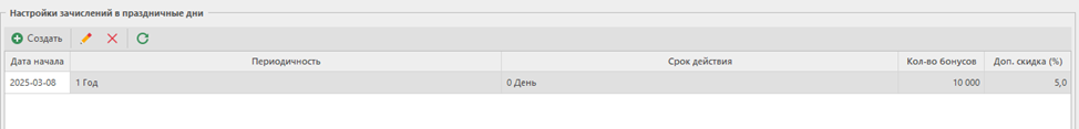 После создания бонусной системы программы лояльности перейдите на вкладку «Периодические зачисления» и в настройках зачислений в праздничные дни создайте зачисления в праздничные дни.