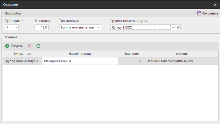 4. В настройках промоакции укажите скидку 15% на группу номенклатуры – кетчуп определенного бренда, например, HEINZ.