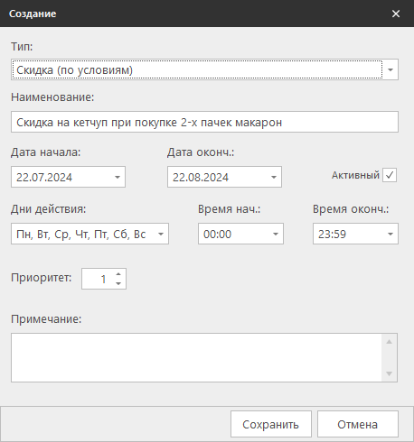 Настройки промоакции в REGOS: Store Management довольно гибкие и могут быть адаптированы под ваши условия. Например, можно указать, что акция действует в определенные дни или часы. Также можно расширить условия акции, чтобы при покупке двух пачек макарон и двух пачек риса клиент получал скидку не только на кетчуп, но и на майонез.