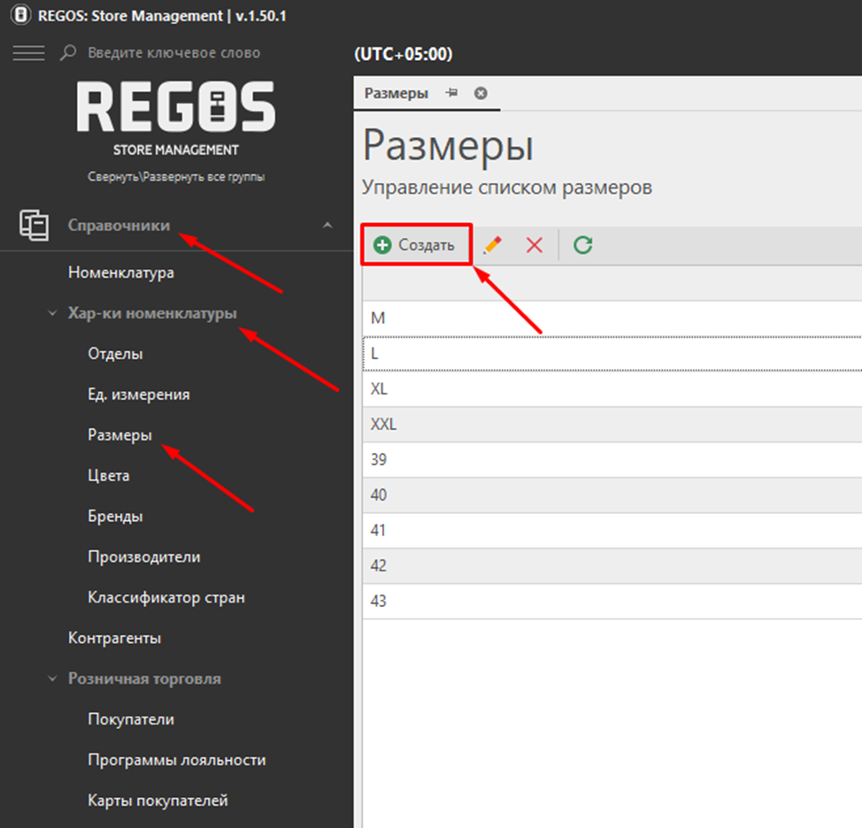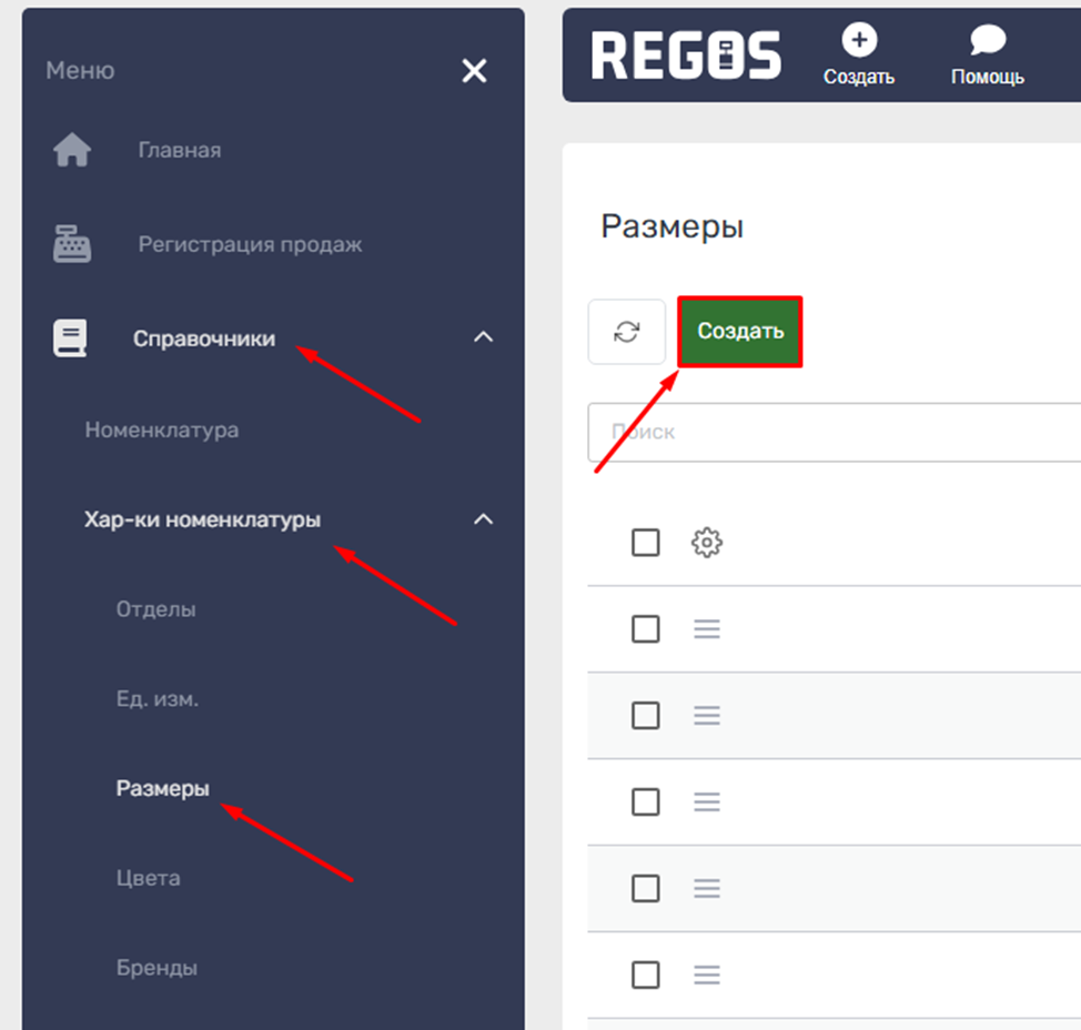 Чтобы правильно настроить размеры в Сервисе REGOS, выполните несколько шагов: 1. Перейдите в раздел "Характеристики номенклатуры", выберите "Размеры" и нажмите кнопку «Создать» чтобы добавить новый размер.