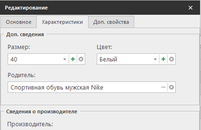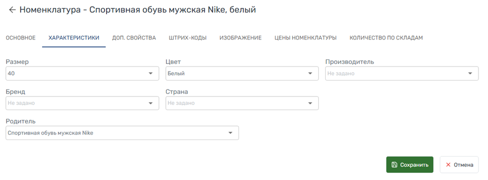 Пример REGOS: Online 3. Создайте новую номенклатуры и в разделе "Характеристики" укажите родителя и размер. Также можно указать цвет, после создания цветовых вариантов в разделе "Цвета".