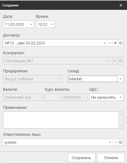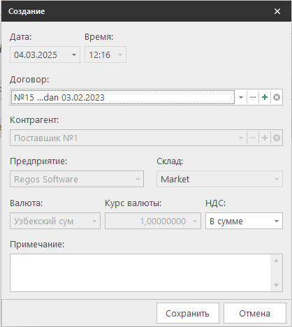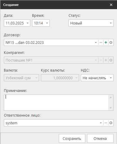 - Договор — Если указан договор с контрагентом, другие поля заполняются автоматически.