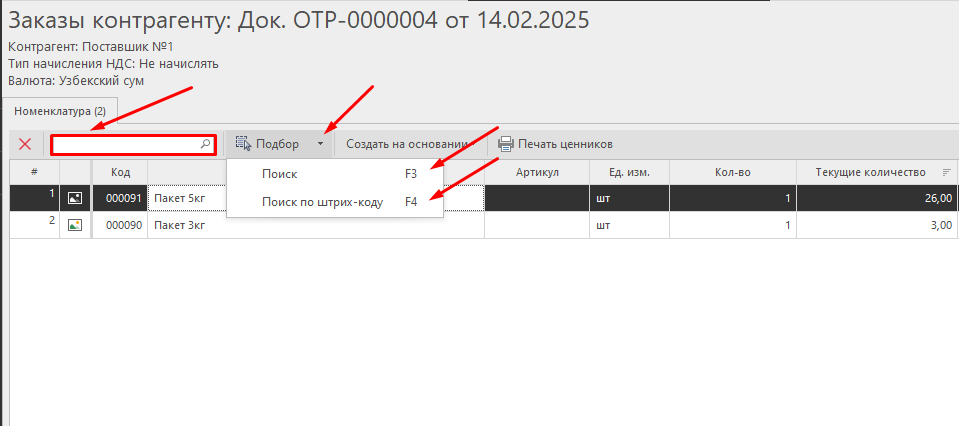 - Поиск номенклатуры по штрих-коду в строке поиска.