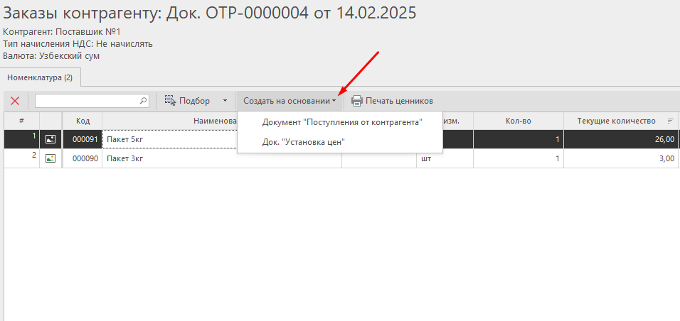 - Создать на основании — на основании поступления можно создать документы "Установка цен" или "Отгрузка контрагенту".