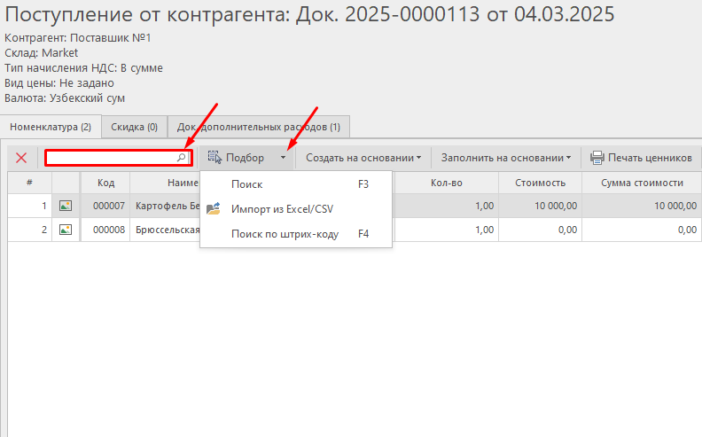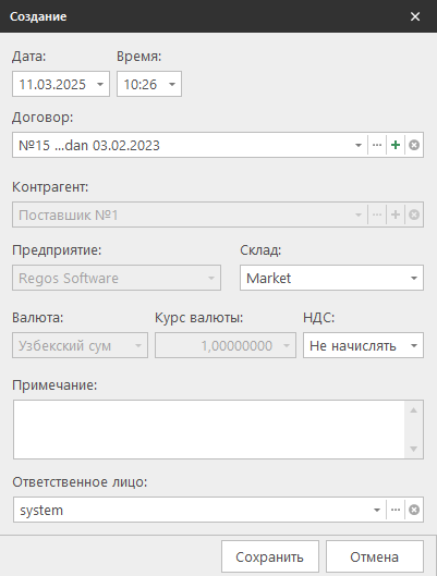 Создание документа поступления от контрагента