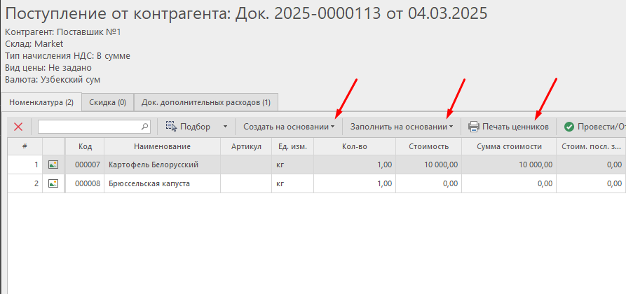 - Заполнить на основании — на основании поступления можно заполнить документ "Заказ контрагенту" и себестоимость по последнему поступлению.