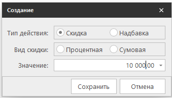 Система позволяет добавлять скидки на уровне документа. Для этого нужно указать тип скидки, её вид и сумму. Эти данные автоматически применяются к товарам, указанным в отгрузке.