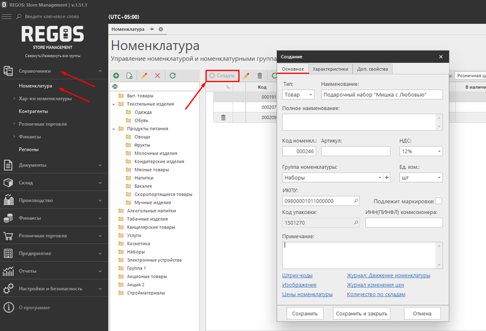 3. Перейдите в раздел "Номенклатура", создайте новую номенклатуру в созданной группе и на вкладке "Основное" заполните обязательные параметры номенклатуры.