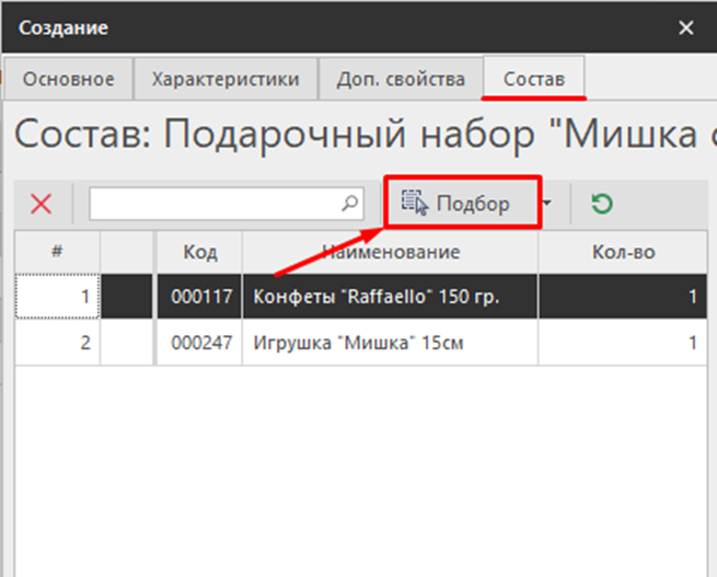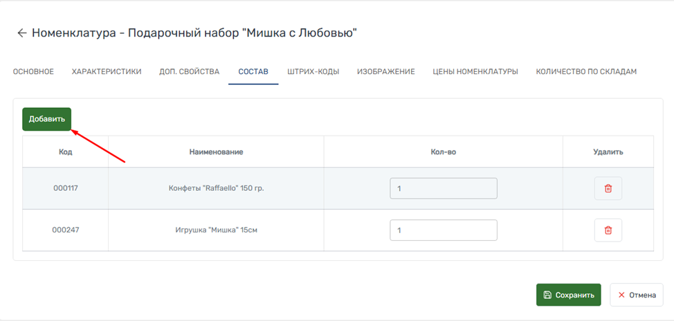 5. После того как товар будет сохранен, откроется вкладка "Состав", где можно добавить все элементы, входящие в состав набора. Укажите количество каждой позиции, а также их вес, если это необходимо для учета.