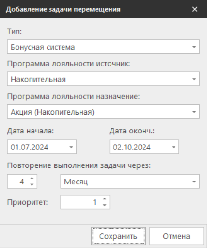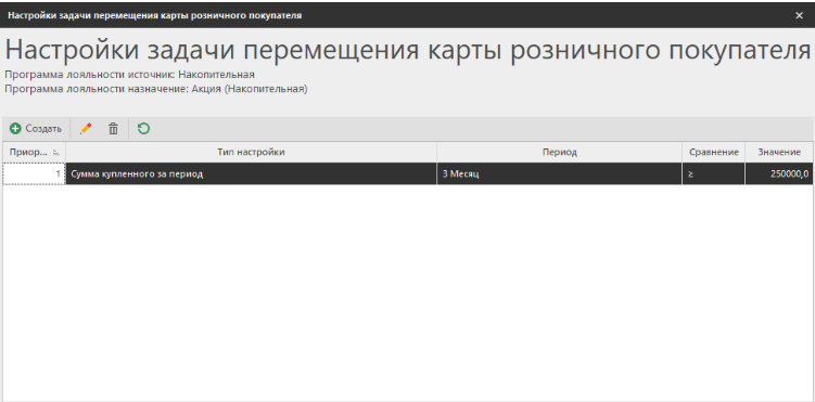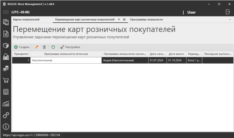 - Попадите в раздел настроек "Перемещения карт розничных покупателей" и создайте новое перемещение, указав: