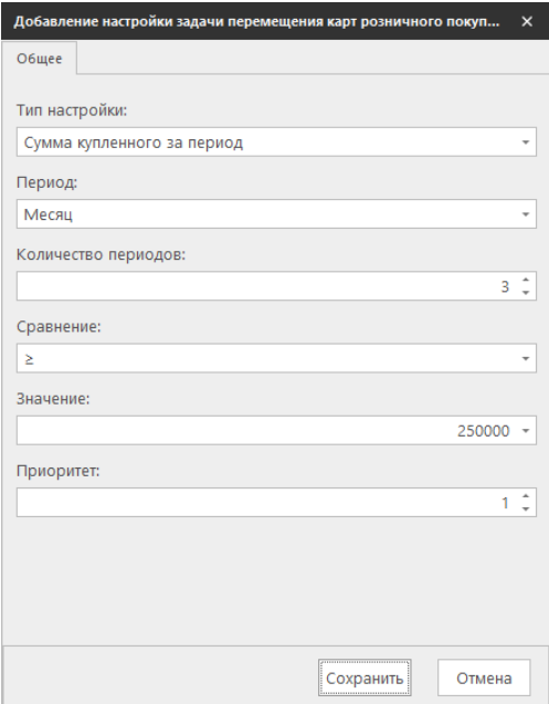 - В настройках перемещения создайте задачу с типом "Сумма купленного за период (суммарно по всем чекам покупателя)".