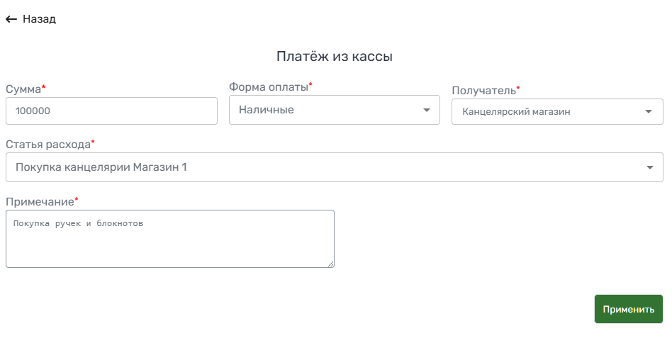 Пример статьи расходов: «Курьерские услуги», «Аренда», «Зарплата персонала», «Реклама».