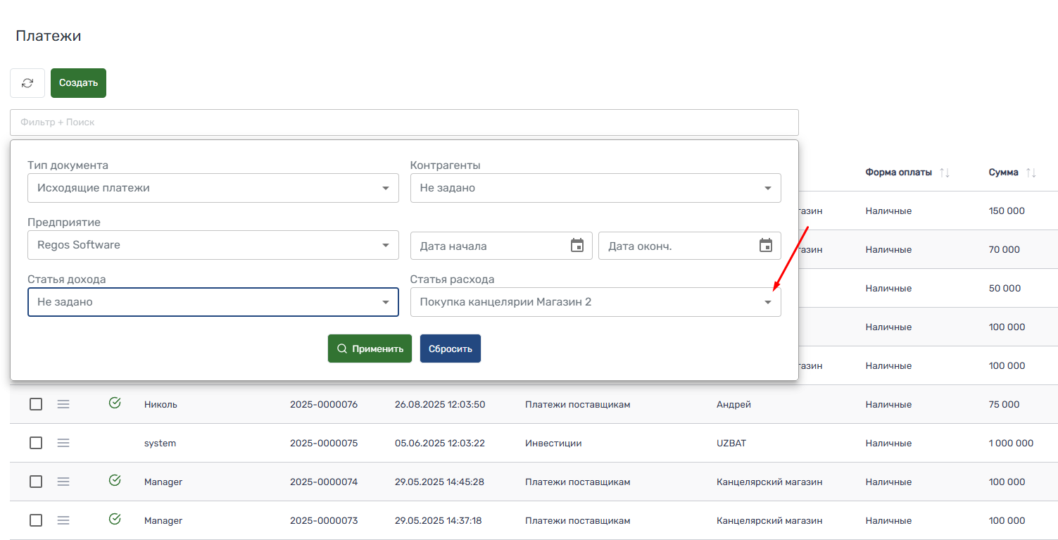 - Выставьте фильтр по нужной статье расходов (например, «Покупка канцелярии магазин 2»).