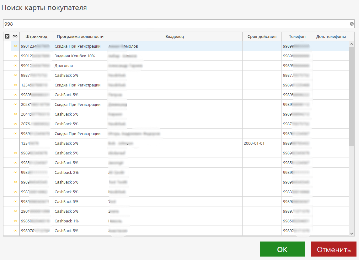 REGOS:POS позволяет находить карту покупателя за несколько секунд как по штрих-коду, так и через поиск.